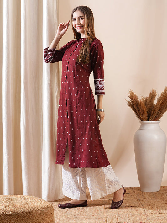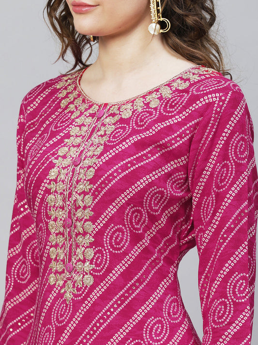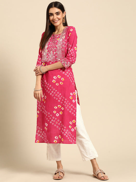 Bandhani Printed & Embroidered Straight Fit Kurta - Magenta