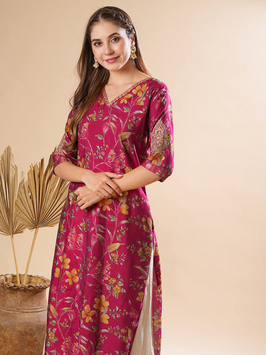 Abstract Foil Floral Printed & Zari Embroidered Straight Fit Kurta - Magenta