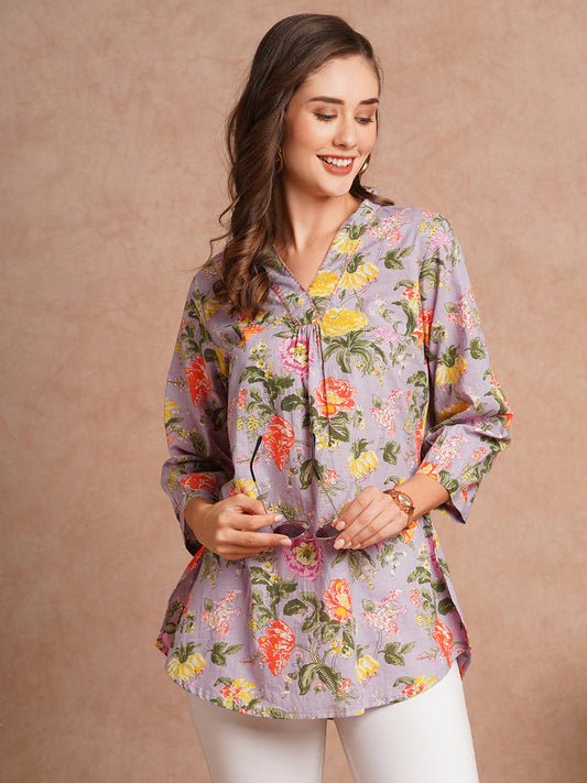 Abstract Floral Printed Straight Fit Kurti - Lavender