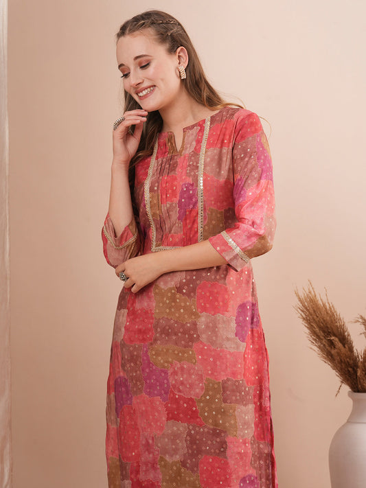 Bandhani Print & Sequins Embroidered Straight Kurta - Pink