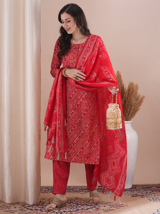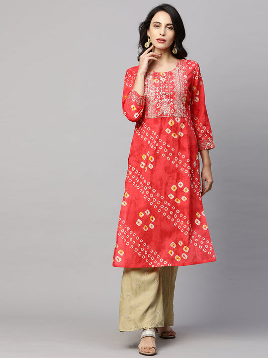 Bandhani Print & Sequins Embroidered Straight Kurta - Red