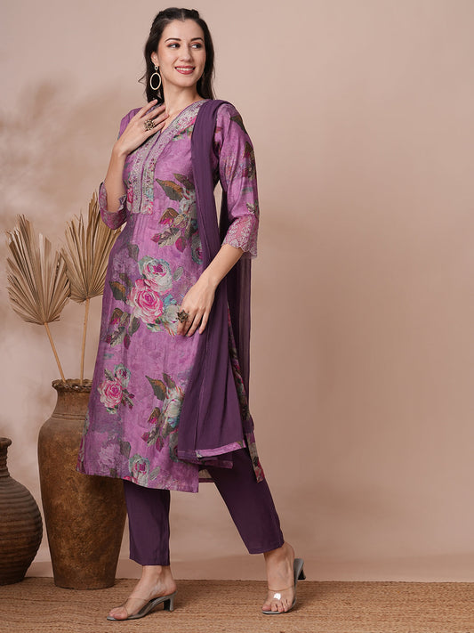 Abstract Printed & Embroidered Straight Fit Kurta with Pant and Dupatta - Purple