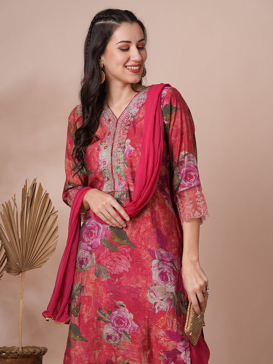 Abstract Printed & Embroidered Straight Fit Kurta with Pant and Dupatta - Pink