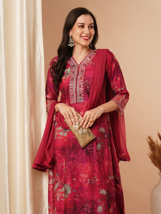 Abstract Printed & Embroidered Straight Fit Kurta with Pant and Dupatta - Magenta