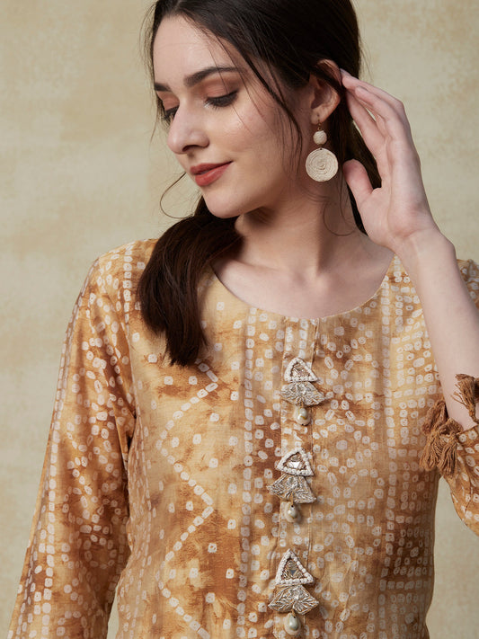 Abstract Bandhani Printed Mirror & Zari Embroidered Latkan Embellished Kurta - Cream