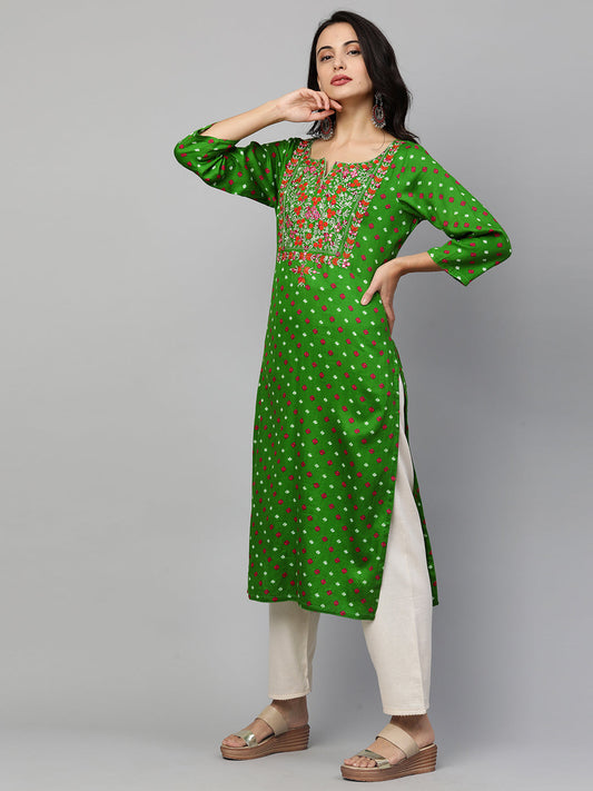 Bandhani & Floral Embroidered Straight Kurta - Green