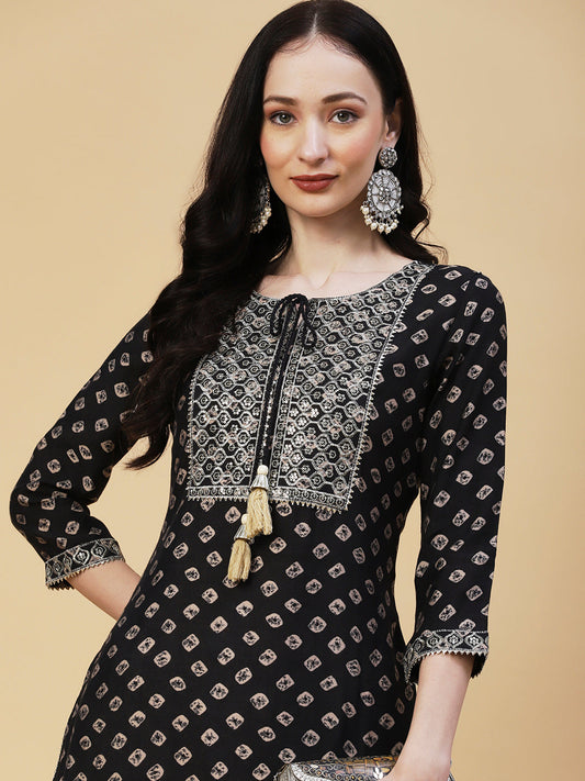 Bandhani Printed & Embroidered Straight Fit Kurta - Black