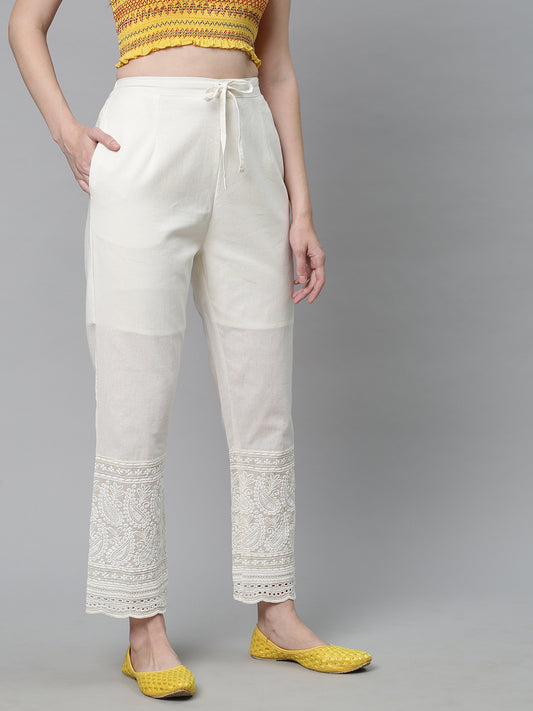 Solid Chikankari Embroidered Straight Fit Pant - Off White
