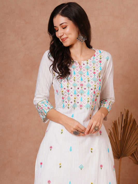 Solid Ethnic Woven & Floral Embroidered Straight Fit Kurta with Salwar - White