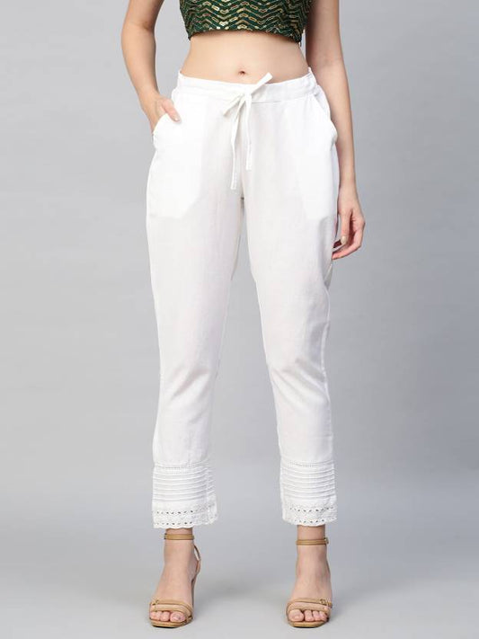 Solid Crochet Lace Patched Straight Fit Palazzo - White