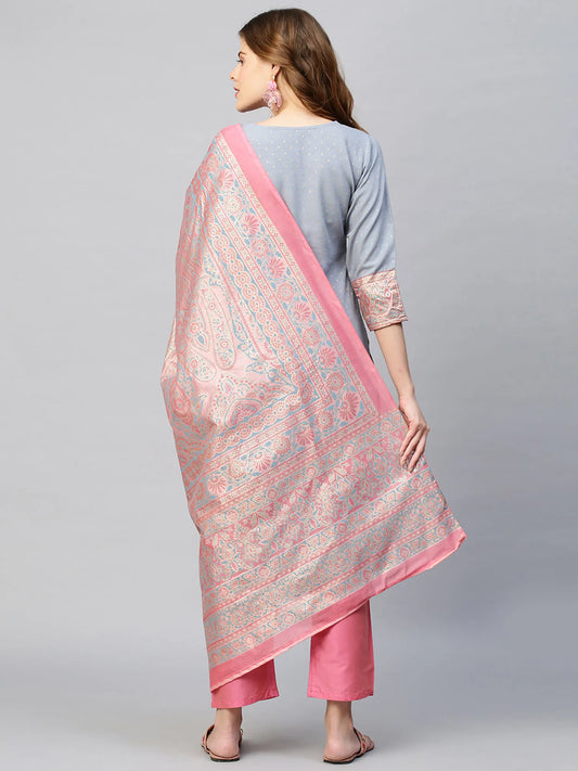 Solid Dobby Rayon Straight Kurta & Pants and Dupatta - Gray