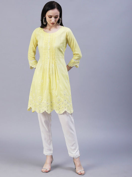 Solid Floral Embroidered Scalloped Hem A-Line Kurta with Pant - Yellow