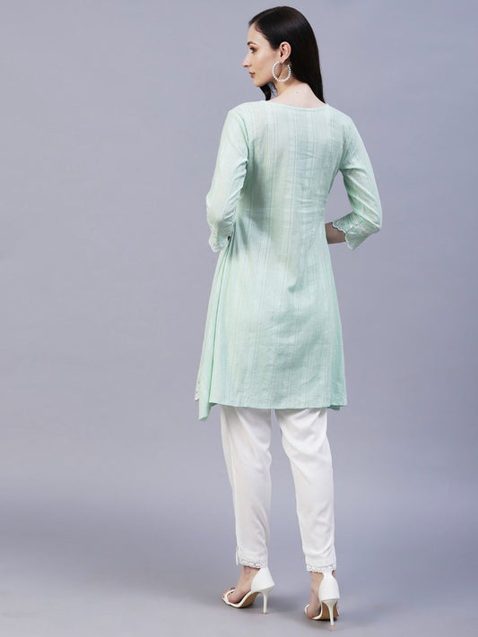 Solid Floral Embroidered Scalloped Hem A-Line Kurta with Pant - Mint Green