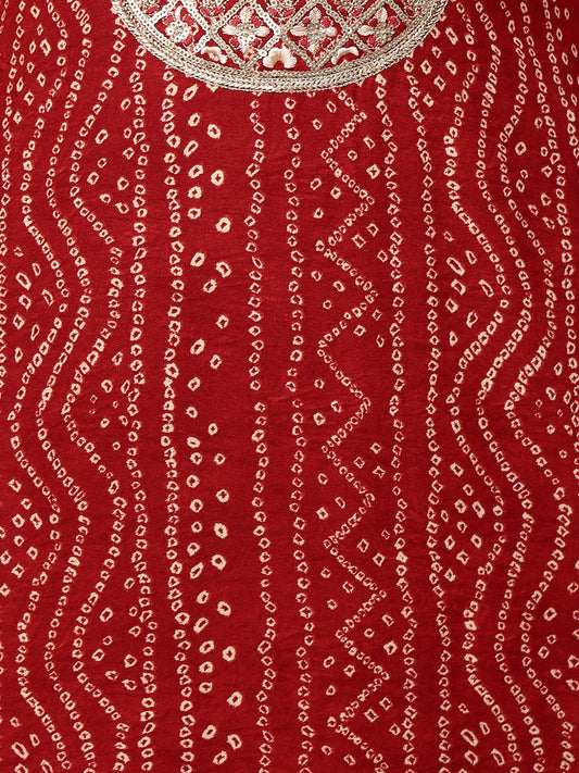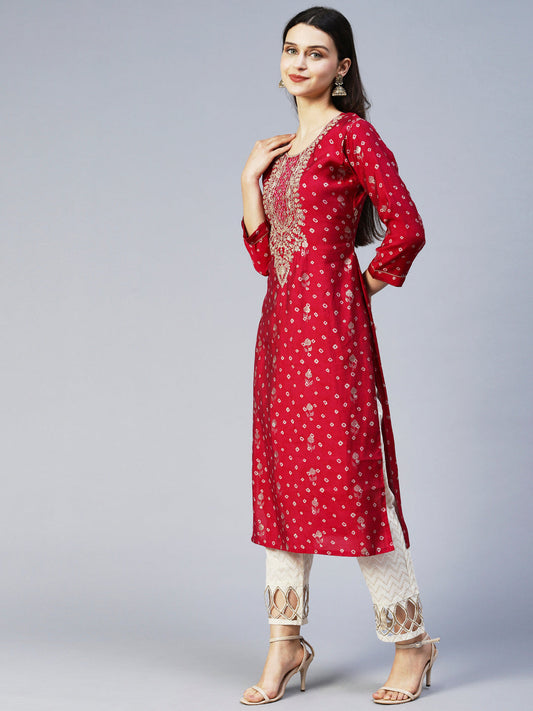 Bandhani Printed & Embroidered Straight Fit Kurta - Red