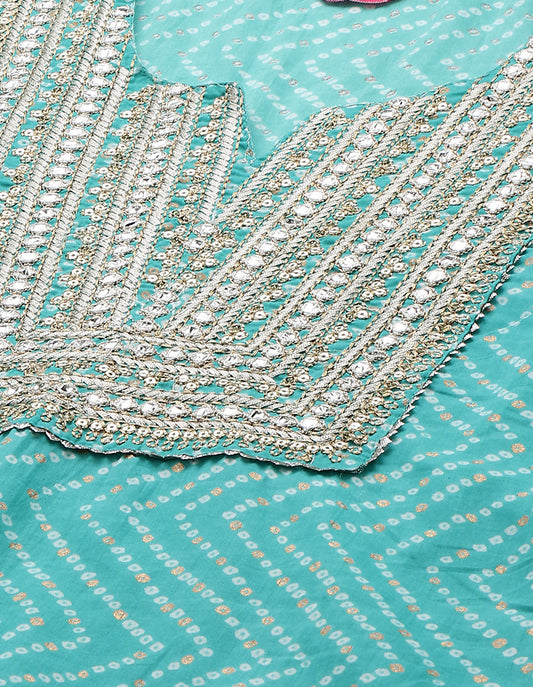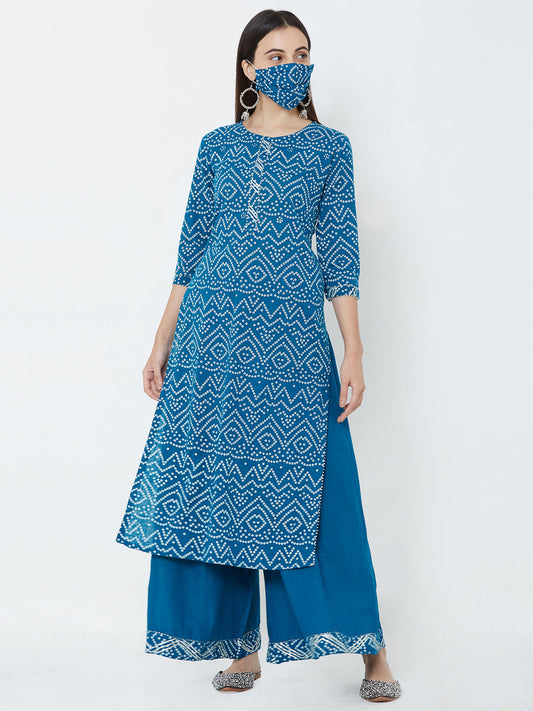Bandhani printed Kurta, solid palazzo with mask - Turquoise