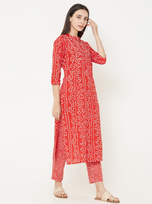 Bandhani Printed Kurta With Leheriya Ankle Pant - Red