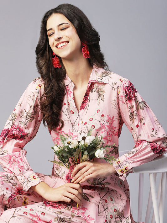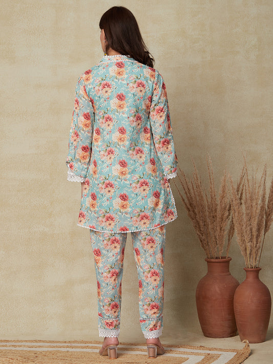 Floral Printed Sequins & Beads Embroidered Short Kurta With Pants Co-ord Set - Mint Green