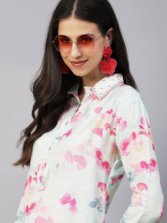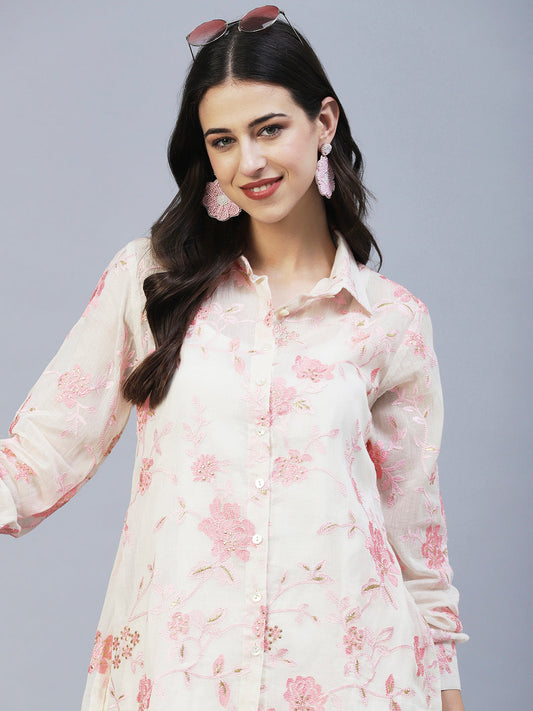 Floral Embroidered Straight Fit Shirt with Pant - Off White