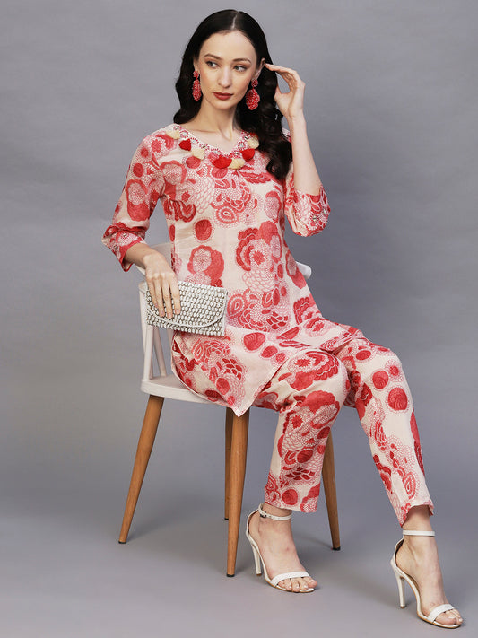 Ethnic Floral Printed Mirror & Resham Embroidered Mul-Cotton Kurta With Pants Co-ord Set - Red & White