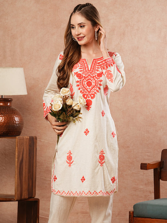 Solid Resham & Mirror Aari Embroidered Kurti with Pants - Off White