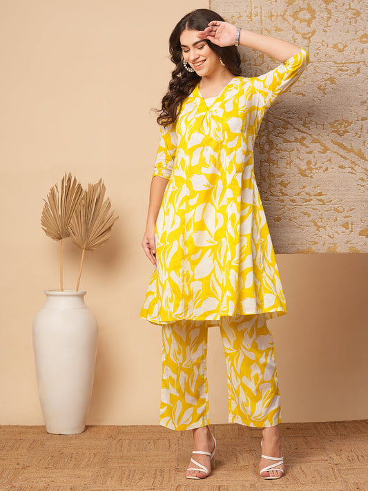Ethnic Floral Block Printed A-Line Paneled Co-ord Set - Yellow