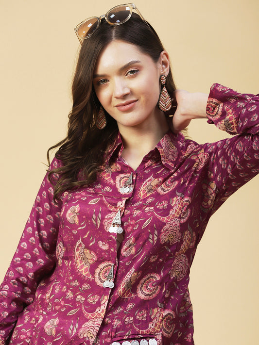 Floral Printed Mirror & Stone Embroidered Shirt With Palazzo Indo-Western Set - Black