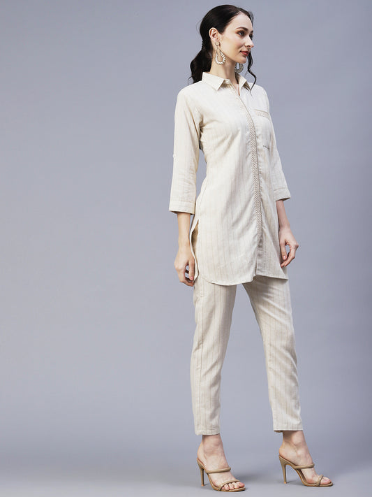 Woven Striped Sequins & Resham Embroidered Lace Ornamented Shirt With Pants - Off-White