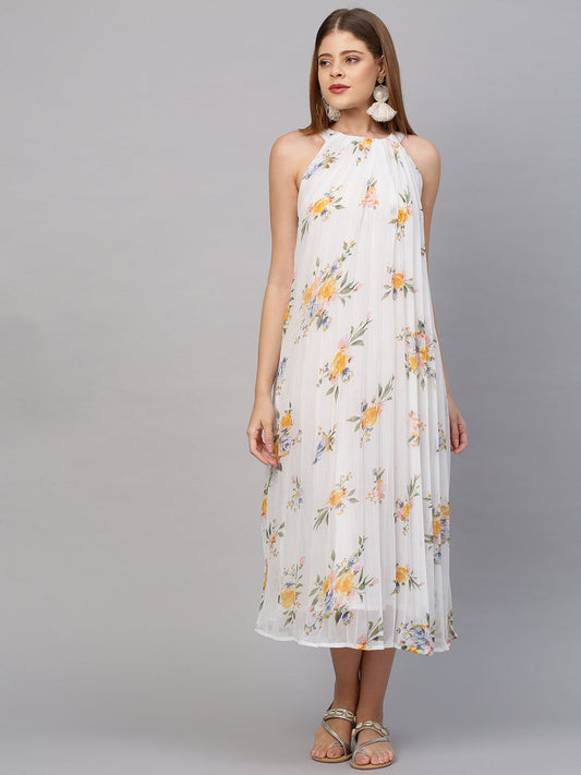 Floral Printed Beads & Resham Embroidered Pleated Maxi Dress - White