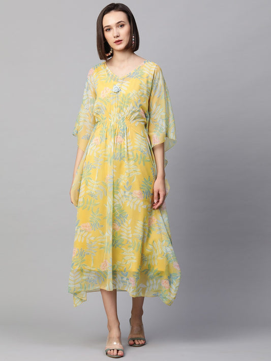 Floral Printed Flared Kaftan Dress - Pastel Yellow