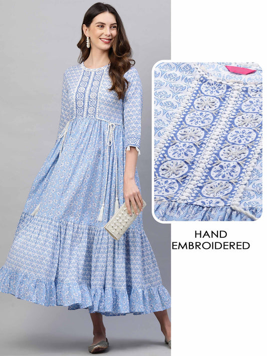 Floral Block Printed & Hand Embroidered Tiered Maxi - Sky Blue