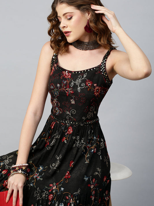Floral Printed & Hand Embroidered A-Line Flared Maxi Dress - Black