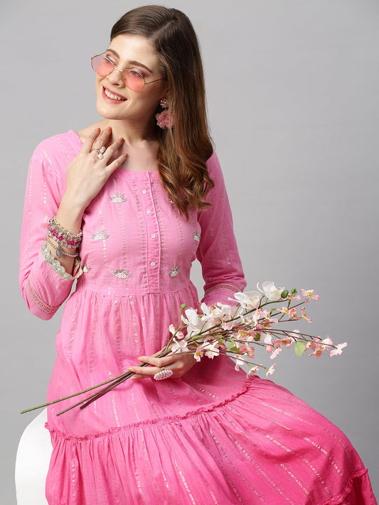Hand Embroidered & Lurex Striped Tiered Flared Maxi Dress - Pink