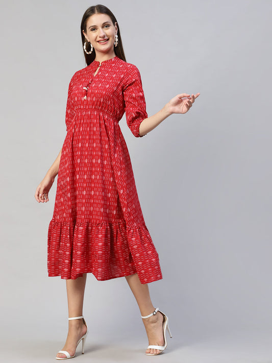 Ethnic Stripes Printed A-Line Flared Midi Dress - Red