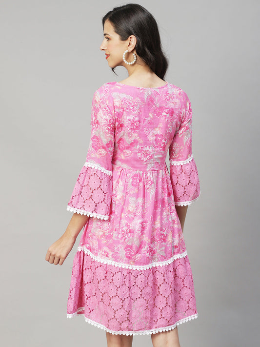 Floral Printed & Embroidered A-Line Midi Dress - Pink