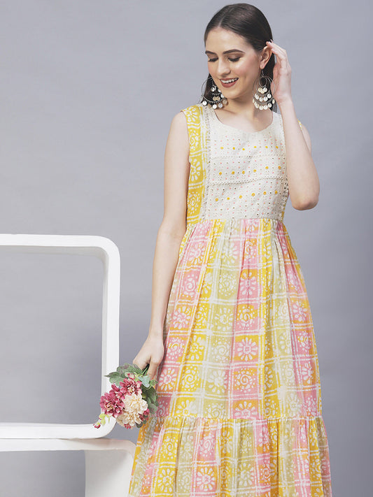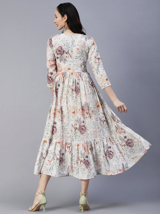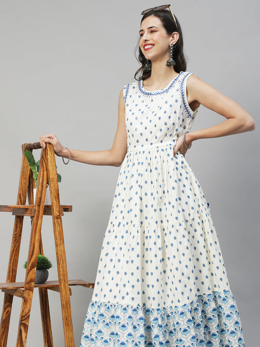 Ethnic Printed & Embroidered Tiered Flared Maxi Dress - Off White