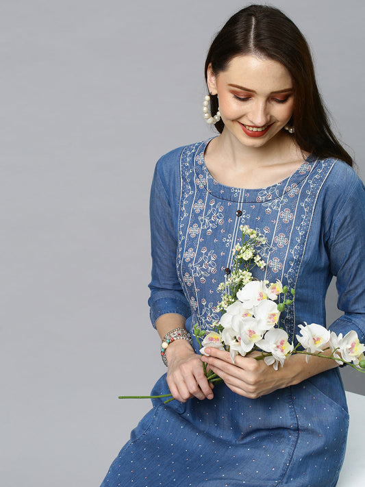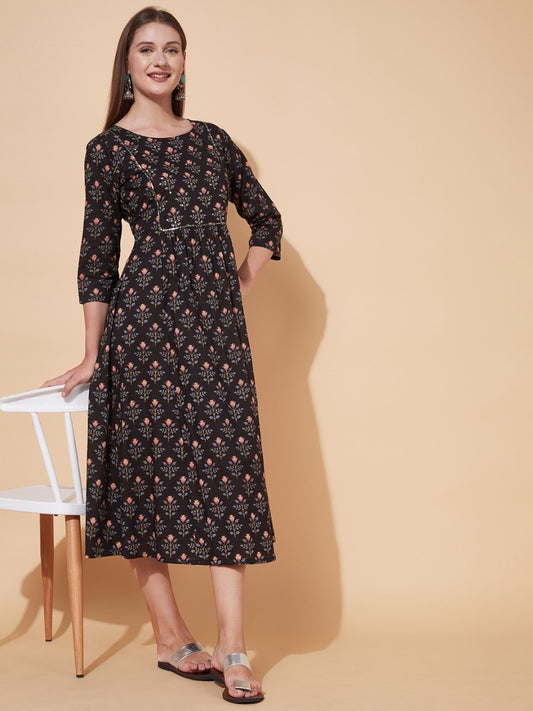 Ethnic Printed & Embroidered Fit & Flare Midi Dress - Deep Navy Blue
