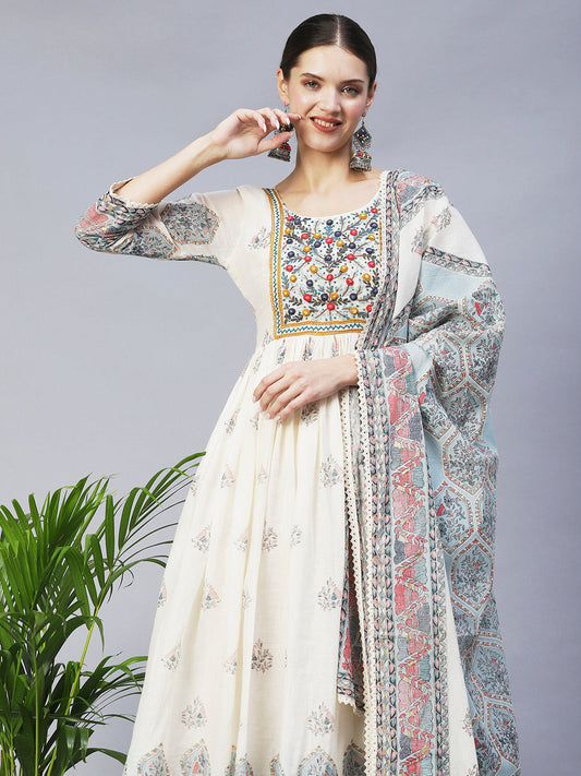 Ethnic Printed & Hand Embroidered Flared Maxi Dress With Dupatta - Off White