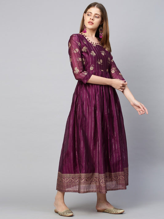 Floral Foil Printed & Lurex Maxi Dress - Purple