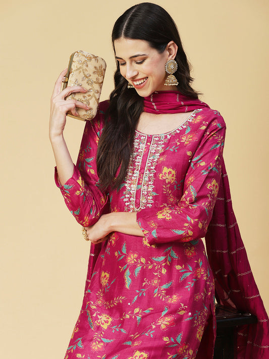 Floral Printed & Hand Embroidered Straight Fit Kurta with Pant & Dupatta - Pink
