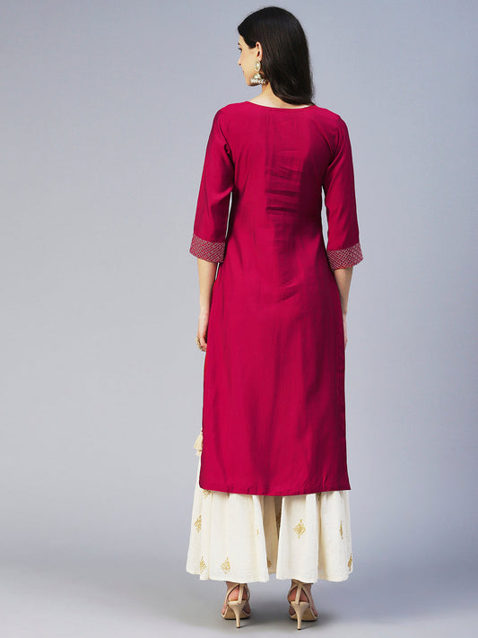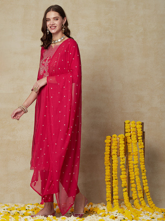 Solid Floral Hand Embroidered Straight Fit Kurta with Pant & Dupatta - Magenta