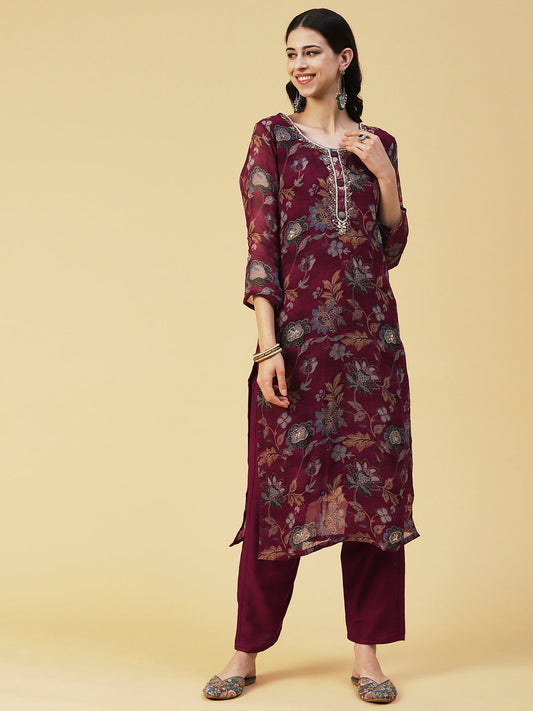 Floral Printed Hand Embroidered Kurta With Pants & Dupatta - Maroon