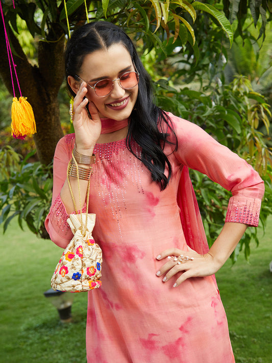 Floral Printed Cutdana, Beads & Sequins Embroidered Kurta With Pants & Dupatta - Pink