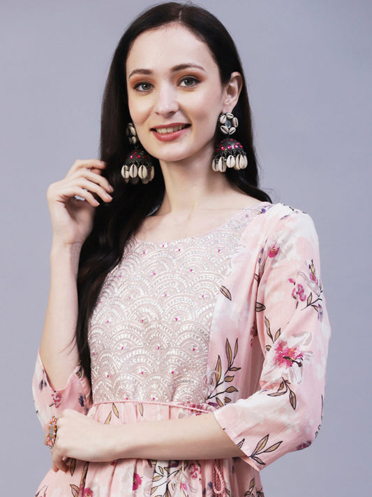 Floral Printed & Embroidered Fit & Flare Maxi Dress - Pink
