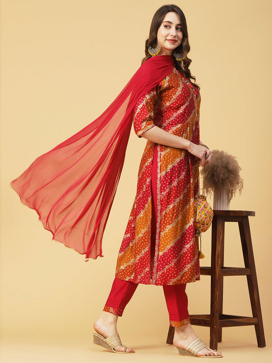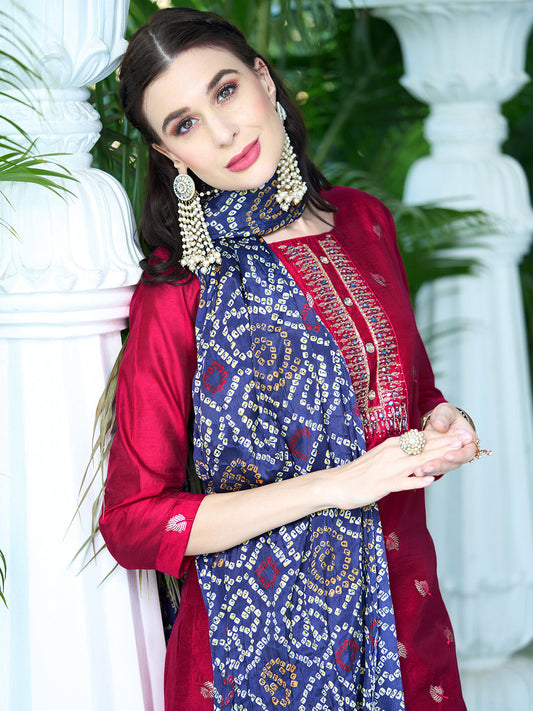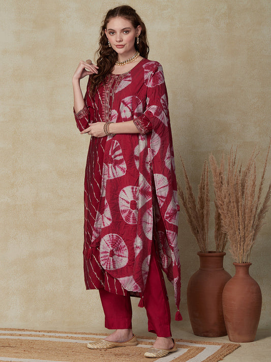 Ethnic Bandhani Printed & Embroidered A-Line Kurta with Pant & Dupatta - Magenta