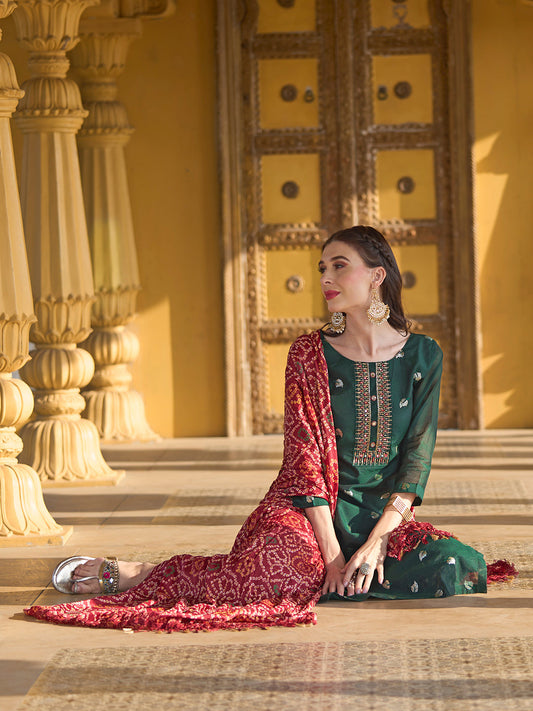 Solid Mirror & Sequins Embroidered Kurta With Pants & Bandhani Dupatta - Green