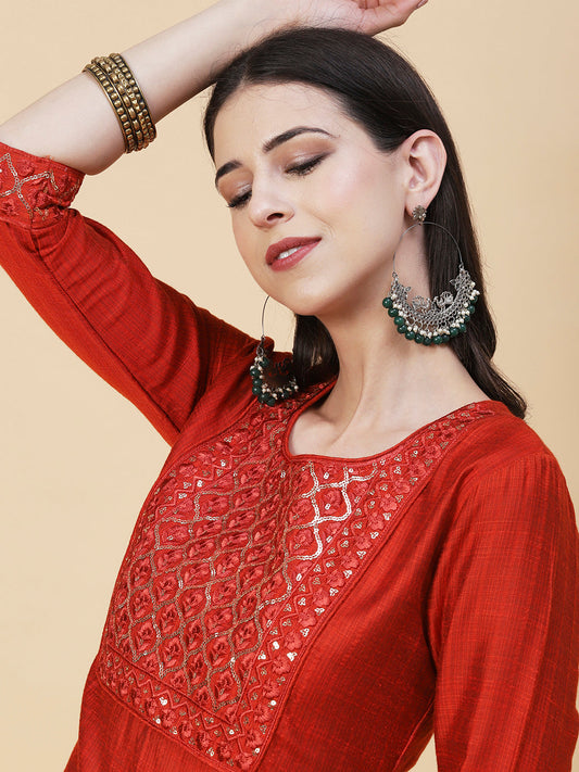 Solid Resham & Beads Embroidered Kurta - Red