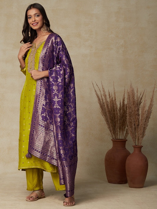 Ethnic Embroidered & Woven Straight Kurta with Pant & Brocade Dupatta - Lime Green