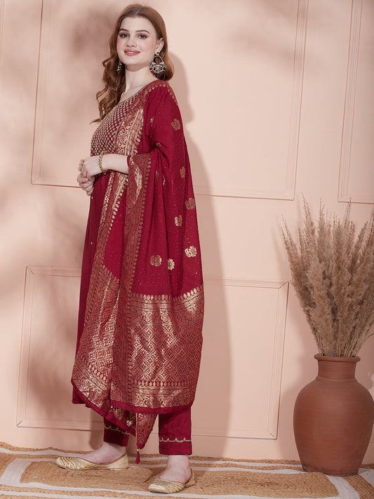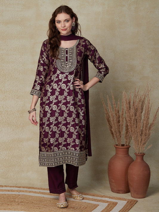 Woven Zari Jacquard Stones, Sequins & Zari Embroidered Kurta with Pants & Dupatta - Mauve