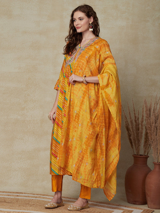 Lehriya Printed Mirror, & Zari Embroidered A-line Kurta with Pants & Shibori Dupatta - Yellow