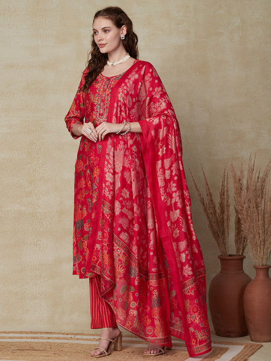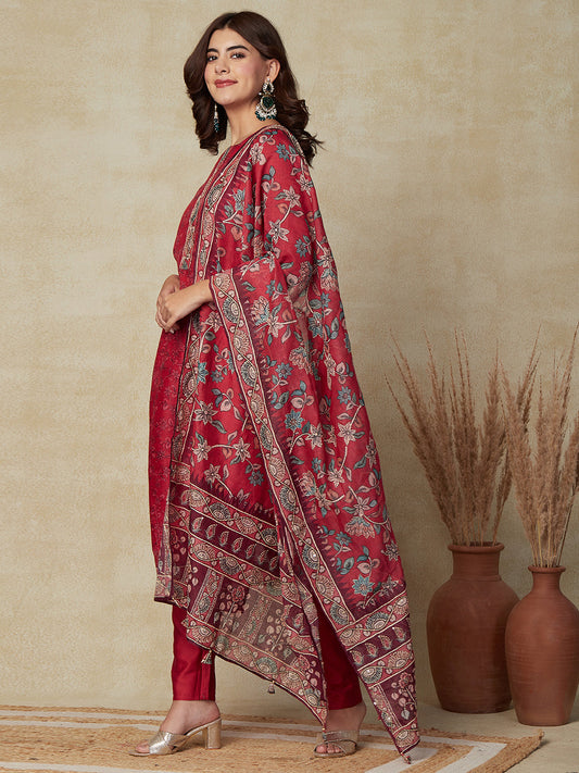 Floral Printed & Embroidered Straight Fit Kurta with Pant & Dupatta - Red